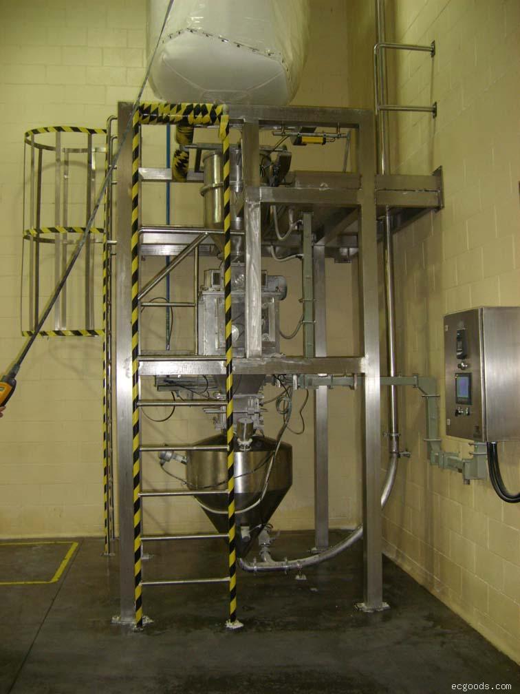 噸包拆包機卸載方式主要分為兩種:一種是大袋開袋后和大袋卸料站叉車將大袋(或噸袋)吊裝到卸料機的機架上,它本身不帶起重設備,二是大袋開袋站和大袋卸料站是靠自身的起重設備將大袋(或噸袋)吊裝到卸料機的機架上,不需要外界的幫助,它通過提升噸袋至設備進料口,人工拆開噸袋下料口,打開流量閥并附以拍打、振動、破碎等裝置,促使袋內(nèi)的粉粒狀物料靠重力落進料倉來完成拆包卸料工作,整個過程是全自動控制,系統(tǒng)操作穩(wěn)定,能完成連續(xù)拆包的任務,操作過程簡單方便,通過相關(guān)實驗結(jié)果可知,拆完一包料的時間大約是5-6分鐘,領先于國內(nèi)大多機械設備生產(chǎn)公司。